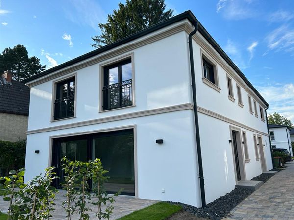 - Fassadenausführung als Wärmedämmverbundsystem mit weißem Feinputz und farblich abgesetzten Stuckprofilen vom Hersteller STO