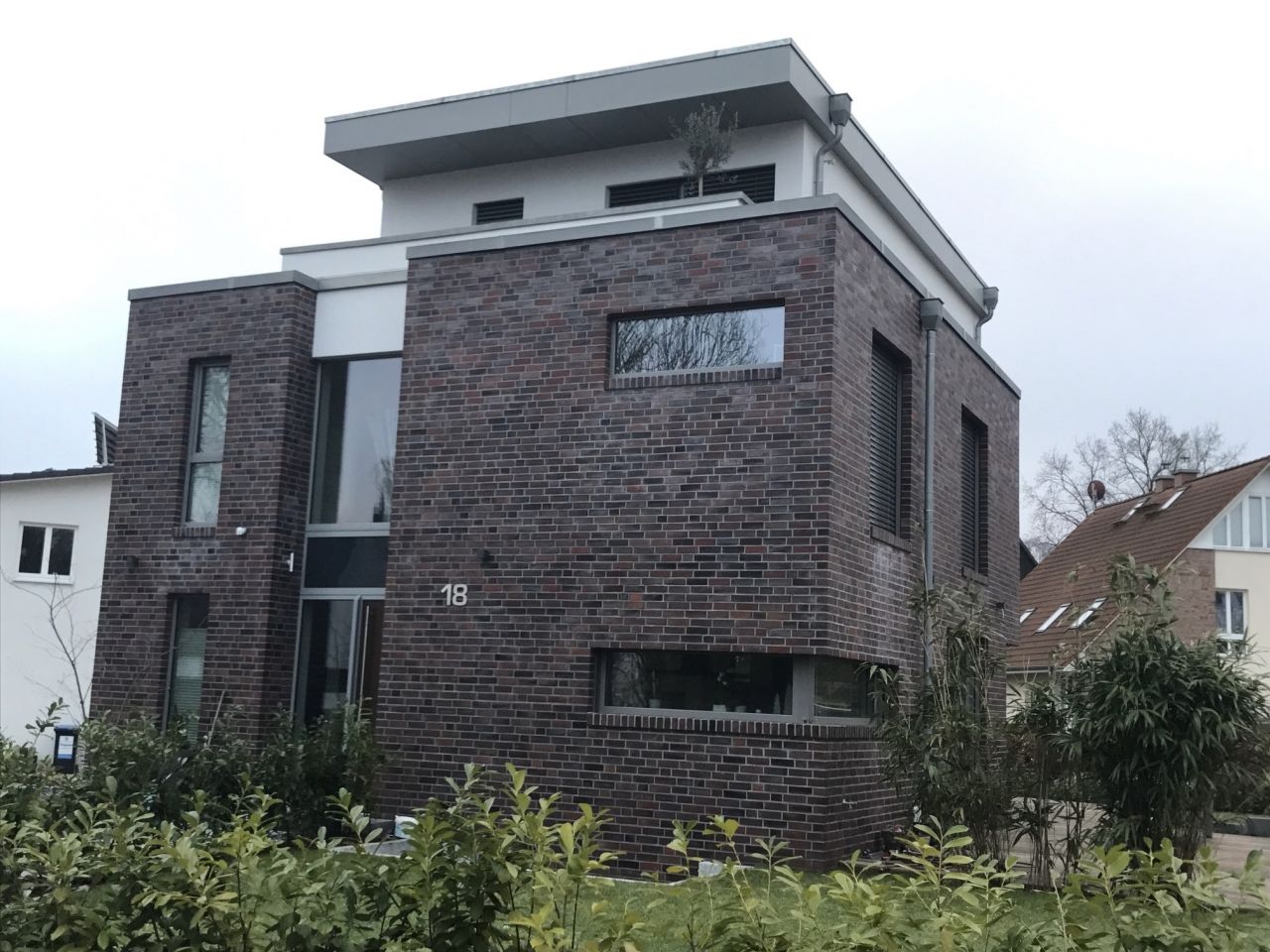Eine moderne Stadtvilla mit Dachterrasse und Garage