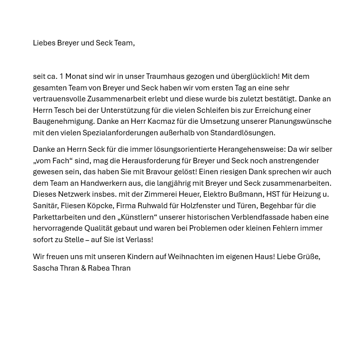 Insgesamt hat Breyer & Seck unsere Erwartungen in jeder Hinsicht übertroffen. Wir können das Unternehmen uneingeschränkt weiterempfehlen und würden jederzeit wieder mit diesem Team bauen. Herzlichen Dank für die hervorragende Leistung und die angenehme Zusammenarbeit!