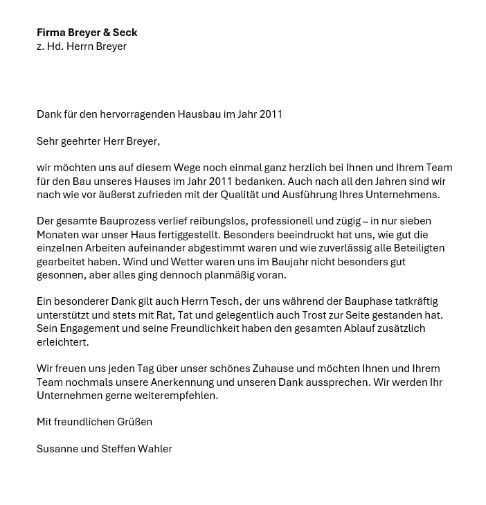 nach 14 Jahren haben Sie uns um ein Referenzschreiben für Ihr Bauunternehmen gebeten und sich nach unseren Erfahrungen mit Breyer und Seck Bau erkundigt.